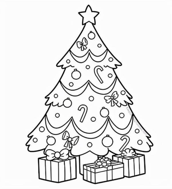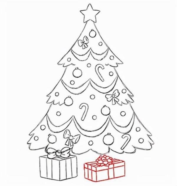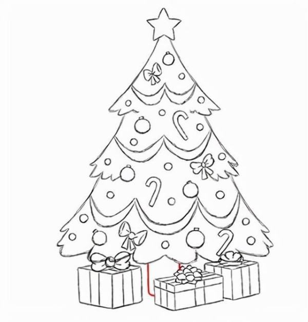 圣诞礼物盒可以多画几个,让画面看起来更丰满。最后别忘啦给圣诞树画上树干。