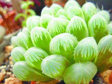 冰灯玉露与常见的姬玉露有些近似,但二者无论在价格上,还是观赏性上都有着很大的差异,主要有以下区别:冰灯玉露的株形较大,单株直径有7~10厘米,而且几乎不出侧芽,更长不成群生的植株,其肉质叶顶端非常通透,像冰一样透亮,叶缘有毛刺,但顶端没有毛,肉质叶上端深色线条是不到顶的;而姬玉露的株形较小,直径只有3~4厘米,容易出侧芽,往往会长成很大的群生植株,其肉质叶看上去不是那么通透,叶缘也没有毛刺,顶端有一根长毛,深色线条则是到顶的。