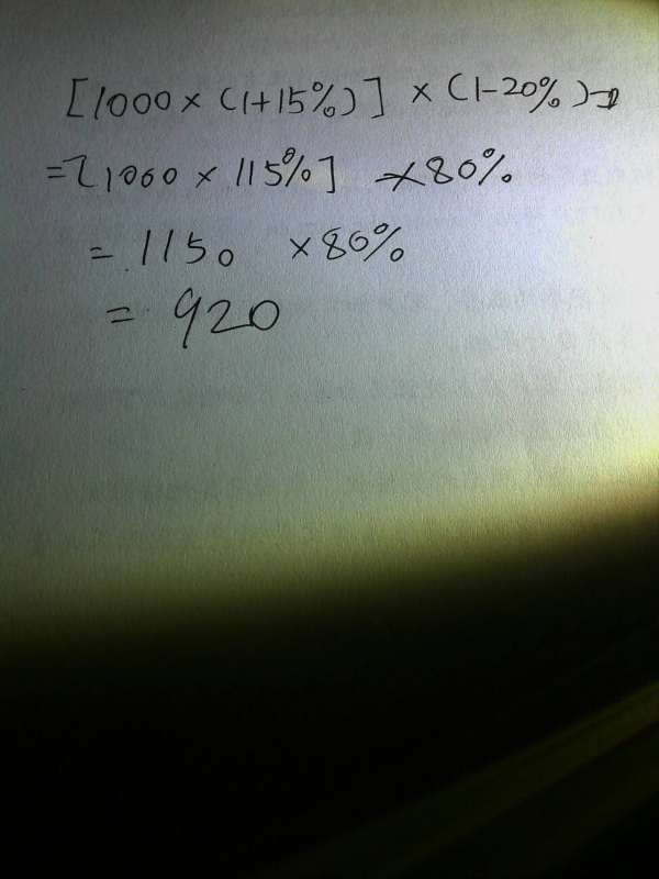 一、 (1+15%)×(1-20%)=92% 答:辣椒的质是西柿的92%。 二、(1)240÷20%=1200(毫升) 答:这瓶饮料有1200毫升。 (2)1200-240=960(毫升) 或者:1200×(1-20%)=960(毫升) 答:还剩下960毫升饮料。