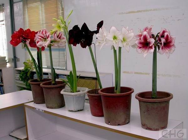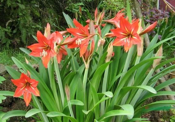是朱顶红。宿根植物,有球根,球根会长出小球根,用以繁殖。还有其他颜色的。请看图。最后一张图是球根。