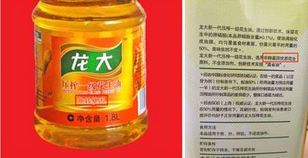 按照自2002年3月20日起我国便开始实施的《农业转基因生物标识管理办法》规定,被列入目录的转基因生物产品必须进行标识。因此,我们可以在不少食用油包装上见到是否为转基因油料压榨的字样。通常来说,食用油的非转基因或转基因的标注通常不是在正面就是在侧面或背面的说明里。其标准标注方式有两种,如山东龙大植物油有限公司的标注:龙大压榨一级花生油将“非转基因”以大号字体标注在瓶身正面。而龙大新一代花生油则在侧面说明里注明“非转基因优质花生”。