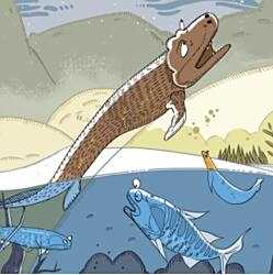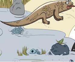 肉鳍鱼的鱼鳍逐渐演化成了可以爬动的四肢,它们已经变成了可以水陆两栖生活的两栖动物,以小型昆虫为食。两栖动物无法完全离开有水的环境,它们必须在水中产卵繁殖。