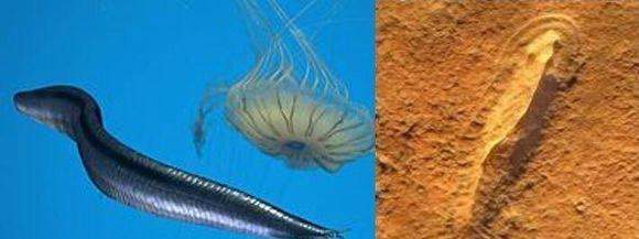 地球生物史虽然可以达到38亿年,但是在很长一段时间内都是简单生物进化过程,道理很简单从零到一的过程是最困难的,基础打好了从一到一百就要轻松一些。大约在6亿年前海洋中的两侧对称生物(bilaterians)分化出了原口动物(protostomes)和后口动物。在5亿5千万年前,后口动物进化发展出现了脊索动物(chordate),这是比较关键性的一步。下图是化石复原图。