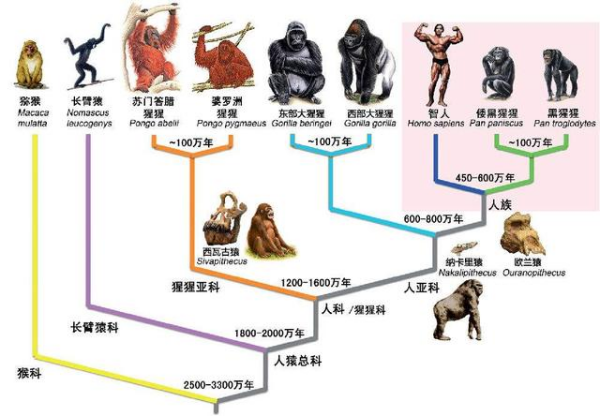 人类和现存的黑猩猩、倭黑猩猩有着非常近的亲缘关系,大约在450万年前我们有着共同的祖先,但在接下进化的过程中它们却走了不同的道路,因此才分化出了不同的物种。