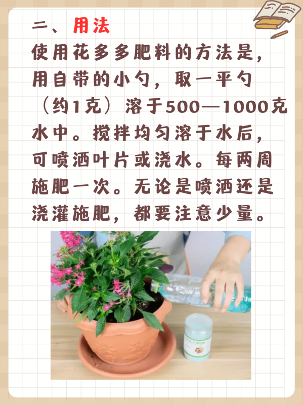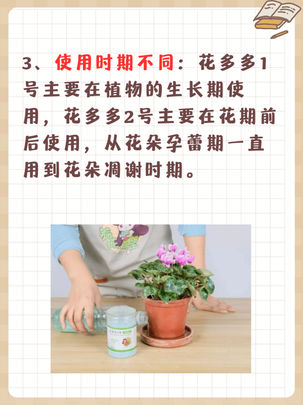 3. 使用时期:花多多1号用于生长期,花多多2号用于花期前后。