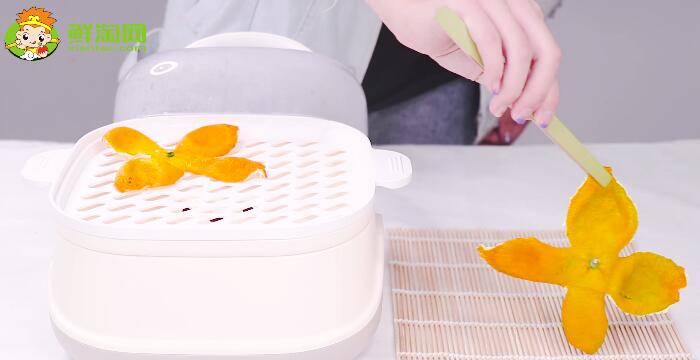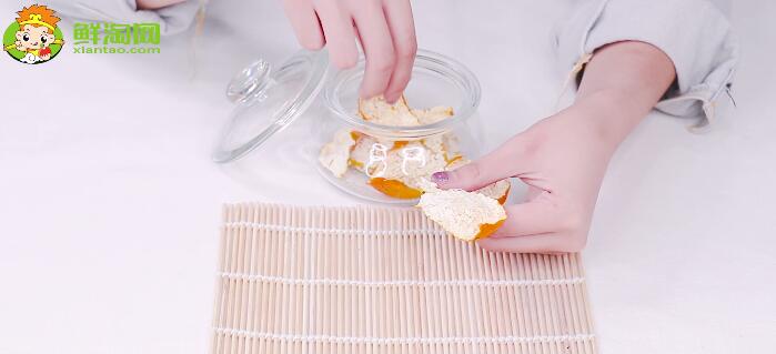 把橘子皮放太阳底下晒干,晒干后,放蒸锅里蒸软,把蒸好的橘子皮再次晒干,蒸晒重复四五次。不断的蒸晒有助于去除橘子表面的细菌及农药残留物