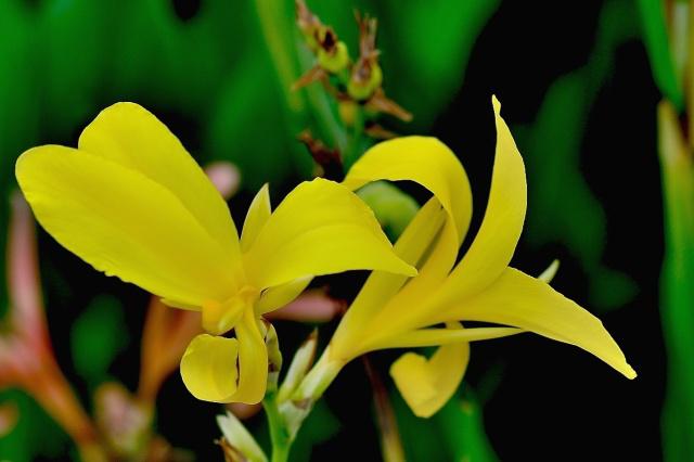 粉美人蕉(学名:CannaglaucaL.):是一种球根草本植物。根茎延长,株高1.5-2米;茎绿色。叶片披针形;总状花序疏花,单生或分叉,稍高出叶上;苞片圆形,褐色,花黄色,无斑点;有多种园艺栽培品种,颜色从粉、橙红色及具带红色斑点等。花期:夏、秋。