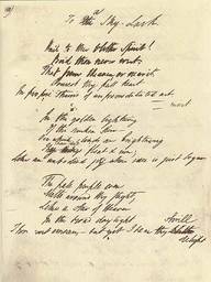 另外,诗歌中大量运用比喻手法,比如,第八节,雪莱直接把云雀比作诗人,说云雀“像一位诗人,隐身在思想的明辉之中,吟诵着即兴的诗韵,直到普天下的同情都被从未留意过的希望和忧虑唤醒”,他以“即兴”再次强调好的艺术品应是真情实感的流露,又以“思想的明辉”突出思想在艺术创作中的地位。