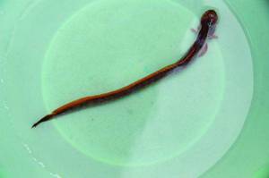 须鳗鰕虎鱼,Taenioides cirratus(Blyth, 1860),是鰕虎鱼科鳗鰕虎鱼属的一种鱼类。外形有点像泥鳅。它全身通红、半透明,颈腹部有像漏斗或喇叭状的半透明红色鳍。双眼退化,像针眼几乎看不到。须鳗虾虎鱼属杂食性,以有机碎屑及小型底栖无脊椎动物为食。以小鱼、小虾为主,虽然长得像外星生物,很有侵略性,但它本身并不那么暴力,会偶尔咬人,有微毒。在香港和越南等地,这类鱼可以作为桌上佳肴。