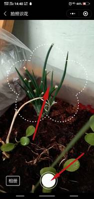 5、将要识别的花草放入中间花朵图案的框中并点击下方的圆形图案。