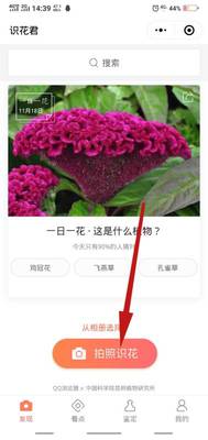 4、进入识花君小程序后,在发现页面点击拍照识花。