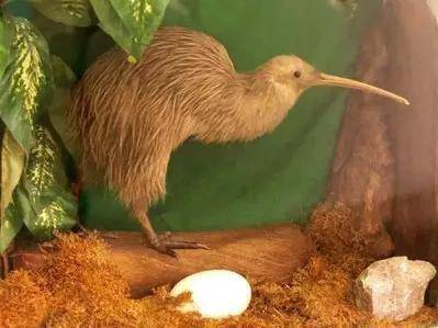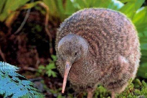 几维鸟因叫声“kiwi”得名,被新西兰人看作是自己民族的象征,并且定为国鸟。他们常常自豪地说:“我是一只几维鸟”,意思就是“我是一个新西兰人”。几维鸟又名鹬鸵,属鹬鸟类中最原始的鸟类。几维鸟在全世界一共只有3种,都分布在大洋洲的新西兰,分别称为褐几维鸟、大斑几维鸟和小斑几维鸟。它形如梨子,浑身长满蓬松细密的羽毛,既没有翅膀也没有尾羽,不能飞翔。可是它的双腿却粗短有力,善于奔跑,时速可达10英里,发起脾气来还能将另一只同类鸟踢出5英尺外。几维鸟喙尖而细长,休息时可当作第三条腿来保持身体的平衡,形如一个三脚架。它的鼻孔长在喙部的最尖端,具有奇特的嗅觉功能,可以找到距地面7英寸土层下的小虫。几维鸟以食昆虫、蚯蚓、浆果、叶子等为生,白天躲在地洞或树根洞内,晚上才出来觅食。它眼小视力弱,有时大白天奔走中遇到前方篱笆挡道,竟毫不回避,犹如瞎子似地一头撞进去。雌性几维鸟一般一两年才下一次蛋,每次一两枚。虽然它的个头与普通母鸡差不多,但下的蛋比鸡蛋大五倍,相当于体重的1/3或1/4。如以鸟的体重和鸟蛋的比例而论,几维鸟蛋恐怕是世界所有鸟类中最大的蛋。