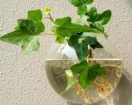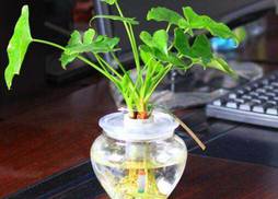 2、将固定好的春羽植株放入诱导池内,如果没有准备诱导池,可以将定植篮放入花瓶内,然后加水,直到水达到定植篮的底部,将根部没入,一周后它会长出水生根。