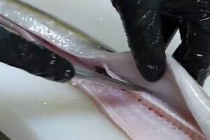 6、继续用刀把鳗鱼的身体与脊柱进行分离,如下图所示: