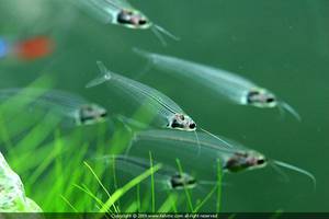 2、玻璃拉拉,体短而侧扁,通体透明如水晶,可清晰的看到内脏、骨骼和血脉,是热带鱼中独具特色的品种。如图: