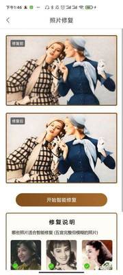 在我们日常娱乐和日常工作中,有时候需要将旧照片修复,如何修复老照片呢?我们可以使用【老照片修复助手】APP完成。使用人工智能技术,可以将模糊照片、低清照片、斑驳痕迹修复,并针对面部进行了高清还原修复。打开APP,然后点击首页的【照片修复】功能。