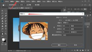 3、接下来在页面上方工具栏中选择红色箭头所指处的“图像”-“图像大小”。