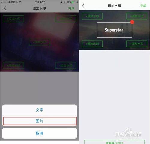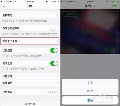 图片传到手机后如果水印文字是黑色或者白色,由于背景是透明,可能在相册里看不到!因为跟背景色重色了,不要管它,这里推荐一个实用工具:下载微商水印相机app,使用上传水印图标功能,在相册里找到你的水印,上传上去就可以加水印了。