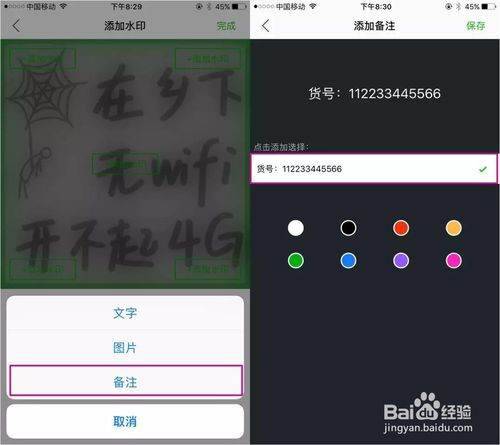 5、如果你在备注里已经设置过货号,当您单独为图文设置水印时,选择备注则可直接关联该货号哦,货号就会以水印的形式呈现在图片上~