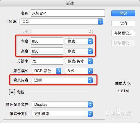 打开后点文件——新建——大小设置为 650px * 650px的就足够用了,如果需要更大的自己改尺寸即可。背景内容 选:透明,点确定。
