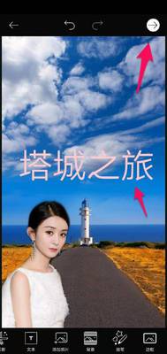 6、最后可以再给照片添加一些文字,然后点击右上角向右箭头保存。一张人物放置风景照里面的图片就完成了。