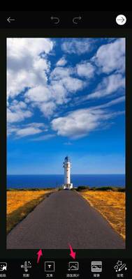 4、在编辑的选项里面先导入一张风景的素材图片,然后再选择下方的添加照片选项。