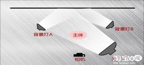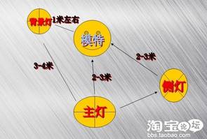 另外考虑颜色。其中,红,黑,蓝,都需要对灯光的高低和运近进行调整,特别是紫色系,容易出现偏色。灯光要多次调整才能得到满意的结果。两个辅灯把物品的边缘都打亮,然后主灯对准主体。相机与主灯平行,距离视摆设物大小调整。这样拍出来的图片做抠图也很饱满。拍平铺有三个135W的常亮灯也可以了,最好有一个主灯,两个辅灯。下面是服装平铺的布光示意图: