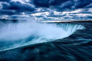 尼亚加拉河的水流冲下悬崖至下游重新汇合,在不足2公里长的河段里以每小时35.4公里的速度跌荡而下15.8米的落差,演绎出世界上最狂野的漩涡急流,经过左岸加拿大的昆斯顿、右岸美国的利维斯顿,冲过"魔鬼洞急流",沿着最后的"利维斯顿支流峡谷"由西向东进入安大略湖。