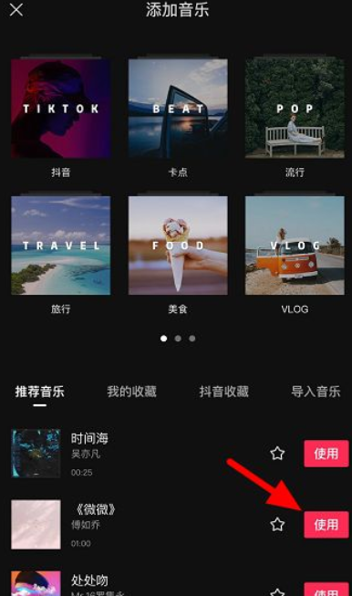 3、将添加进去的素材照片添加到时间轴上,再→点击添加音乐,→点击添加进去即可;