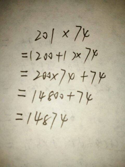 解题步骤: 71Ⅹ201 =71×(200+1) =71×200+71 =14200+71 =14271 拓展信息: 1.每做一道题的时候,不要总想着自己会怎样怎样粗心,首先要对自己有信心,这点很重要啊,否则,题目还没做,心理防线就已经被击垮了。 总之要对自己有信心。 2.确立信心之后,开始看题,不要想着快速的把题目看完就开始做题,题目应该多读几遍。我以前为了赶时间,就大概的看下题目,结果解了好长时间都没解出来,最后只好放弃。可是当老师讲的时候才发现,自己有一个条件没有看见。做数学嘛,讲究的就是细节问题。 3.我们老师说过,世界上不存在粗心的学生,只存在对某个知识点,某类题型不熟悉的学生,想要