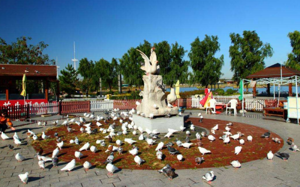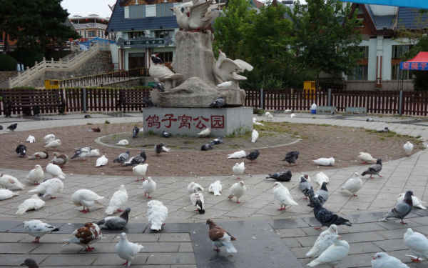 被人们视为北戴河区象征的鸽子窝公园位于北戴河区海滨东北角。在那由于地层断裂所形成的20余米的临海悬崖上,有一块嶙峋巨石,恰似雄鹰屹立在海边,因这里曾是野鸽的栖息地,所以留下了鸽子窝的名字。与这块巨石比肩而立的崖顶上,建有一座具有民族特色的亭子--鹰角亭。该亭始建于1937年,几经翻修,现亭上挂有全国人大常委会副委员长胡厥文1983年的题匾。亭南的大理石卧碑上,镌刻着毛泽东1954年秋在这里构思赋就的《浪淘沙·北戴河》,在鸽子窝的南面还有一座望海长廊,长廊的南北两头分别由四角亭和敞亭组成。