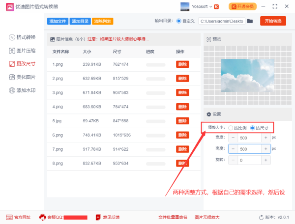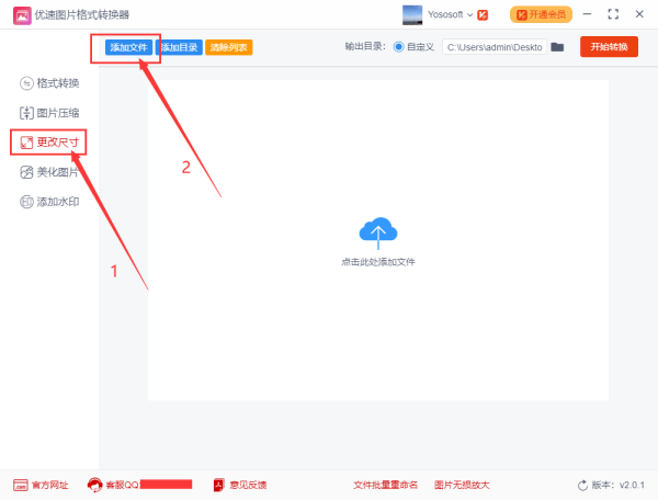 步骤1,下载并安装优速图片格式转换器,再打开使用。软件左边有5个功能,点击【修改尺寸】功能。然后再点击【添加文件】或【添加目录】按钮,将需要调整大小的图片全部导入到软件中,批量修改节省时间。
