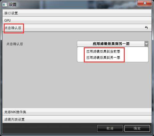 选择“点击确认之后”,切换一下里面的这两个选项(应用滤镜效果到当前层/另一层),然后点击“确定”,就可以了。