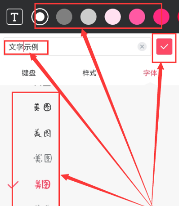 五、在文字框内输入文字,使用颜色块选择文字的颜色,然后使用下方的列表更改文字字体,最后点击“√”。