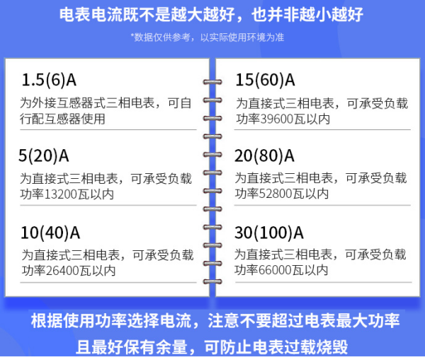 使用电能表时要注意,在低电压(不超过500伏)和小电流(几十安)的情况下,电能表可直接接入电路进行测量。在高电压或大电流的情况下,电能表不能直接接入线路,需配合电压互感器或电流互感器使用。