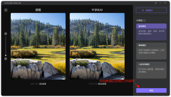 修复结束后选择格式导出即可,牛学长图片修复工具提供4种图片格式:png、jpg、jpeg、webp。用户可以选择喜欢的格式,导出修复后的照片并保存。点击下载修复图片