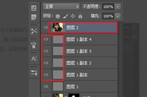 11、一个图层的锐化效果不明显,可以多复制几个图层,复制越多锐化越明显,脸上麻点越多,先盖印所有图层,然后磨皮。这里我复制了四个图层,盖印成图层2。