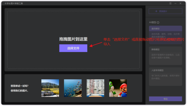 2、启动牛学长图片修复工具后,可以单击“选择文件”或直接拖动图片将原始模糊的图片导入到牛学长图片修复工具中。