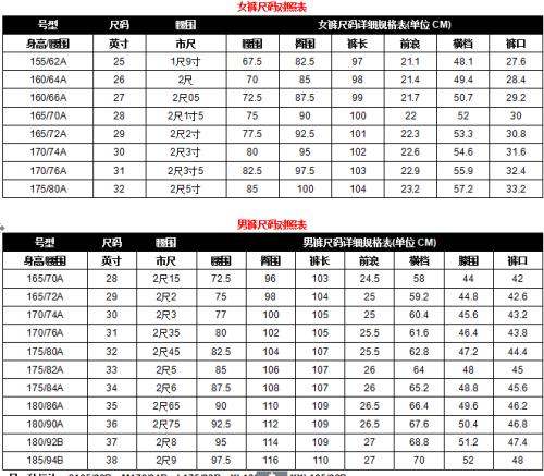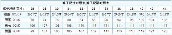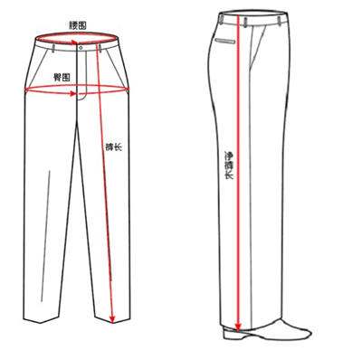 3、裤长由腰口往下到裤子最底边的距离;休闲裤、牛仔裤裤长不含脚口贴边,脚口贴边另预留3-4CM长供自行缭边使用。