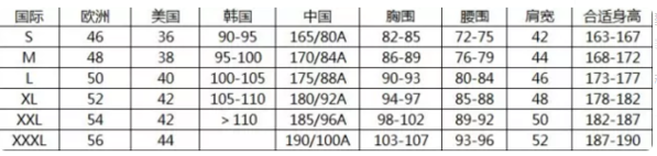 中国 (cm) 165 / 88-90 170 / 96-98 175 / 108-110 180 / 118-122 185 / 126-130