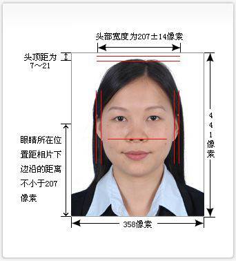 人像在相片矩形框内水平居中,脸部宽207±14像素,头顶发迹距相片上边沿7像素~21像素(当头顶发迹距相片上边沿距离与眼睛所在位置距下边沿的距离不能同时满足要求时,优先保证眼睛所在位置距相片下边沿的距离不小于207像素,特殊情况下可部分切除耸立过高的头发),照片下边缘以刚露出锁骨或者衬衣领尖为准。