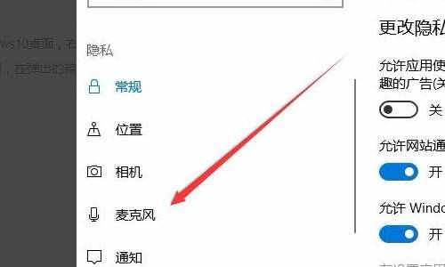 3、在打开的隐私窗口中,点击左侧边栏的的“麦克风”菜单项。