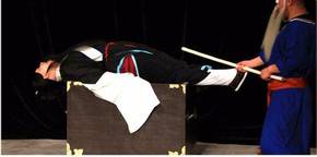 《打棍出箱》里面演员展示的绝活有铁板桥、甩发、蹉步、扔帽子等技法,演员一个“鲤鱼打挺”从箱子里翻出来,笔直地躺在打开的箱子上,然后抢背(空翻)出箱。也有一开始就抢背出箱的演法,也有先铁板桥,然后抢背的演法。