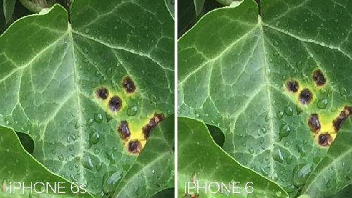 iPhone 6S的对比度更高一些,叶面细节表现力也更强,但是实际可见细节增加的并不明显。