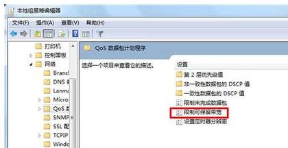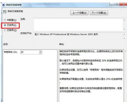 在打开的属性对话框中将“限制可保留带宽”设置为“已启用”。