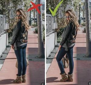 对于拍摄的角度,一定不能平视或俯视,远景的全身照与周围环境互动起来能拍出更好的效果,或是拍局部的时候选择侧面或者让身体更加有线条感。注意下图的姿势是可以学习的。两条腿分开有动感的同时也更显瘦。