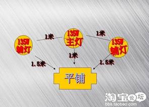 另外考虑颜色。其中,红,黑,蓝,都需要对灯光的高低和运近进行调整,特别是紫色系,容易出现偏色。灯光要多次调整才能得到满意的结果。两个辅灯把物品的边缘都打亮,然后主灯对准主体。相机与主灯平行,距离视摆设物大小调整。这样拍出来的图片做抠图也很饱满。拍平铺有三个135W的常亮灯也可以了,最好有一个主灯,两个辅灯。下面是服装平铺的布光示意图: