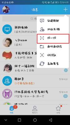 2.打开手机上的QQ,点击右上角的加号,找到扫一扫点击;