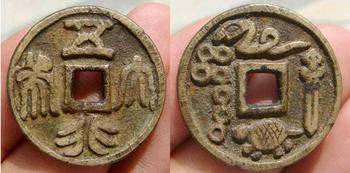 背面是龟蛇剑图案。五行大布是中国古代钱币的一种 北周武帝宇文邕,建德三年(公元574年),以一当十,与布泉、五铢并行。面文“五行大布”玉箸篆,钱文及制作均极为精美,为著名的“北周三品”之一。北周铸“五行大布”钱,与当时的文化、经济、政治斗争有着直接的关系。当时佛教势力控制的和尚有三百万之多,这使的国家的土地和户口受到威胁,赋税得不到保证。加上当时的战事、蝗灾、旱灾等因素,最后罢佛、道两教势力,但对道教不敌视,意味深长地铸了“五行大布”钱。