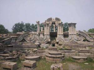 1860年10月6日英法联军洗劫圆明园,抢掠文物,焚烧,同治帝时欲修复,后因财政困难,被迫停止,改建其他建筑。八国联军之后,又遭到匪盗的打击,终变成一片废墟。
